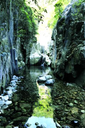 沿著黃巢山盤旋而上,到半山時下車,順山腰行20分鐘,就進到峽谷。谷底是滿眼美麗的鵝卵石———這是峽谷下游的河床,溪水蜿蜒數(shù)公里,再匯入晉江。冬季水枯,光溜溜的鵝卵石,密布河床。潺潺溪水,沖出圈圈水紋,太陽映在潭底,光影動人。