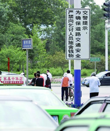 近來,在省城石家莊“迎賓大道”裕華路與建設(shè)大街交叉口,交管部門豎起的兩塊“新式”交通警示牌引發(fā)市民議論!盀榇_保道路交通安全,嚴(yán)禁向乞討人員施舍錢物”的警示語赫然入目,對(duì)此,記者在采訪中也聽到了社會(huì)各界的一些不同看法。