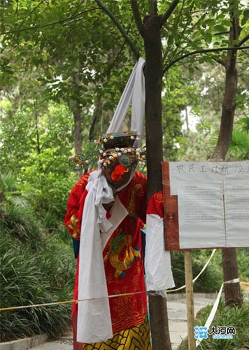 身穿大紅袍,頭戴金冠,脖子套在白布綾挽成的結(jié)上。7月23日下午16時(shí)許,鄭州市紫荊山公園內(nèi)一棵大樹下,一男子扮成一“財(cái)神爺”模樣欲“上吊”尋短見討回農(nóng)民工血汗錢。