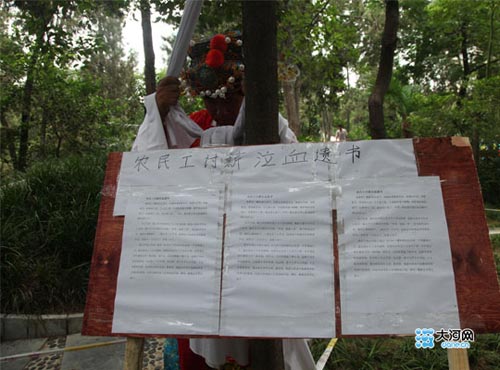 記者在現(xiàn)場(chǎng)看到,“財(cái)神爺”旁邊還放著一塊寫著“農(nóng)民工討薪泣血遺書”的木板。上面寫著“誰(shuí)想死?螻蟻尚且貪生。但我也是被逼無(wú)奈,錢我討不到,房租要交,妻母要生活,工人要工資,可老板拿我當(dāng)球踢,我咨詢過(guò)很多部門,可都幫不了我,我活得太累了,可死,我也要讓黑心的老板們明白些什么?為了生活,我已經(jīng)向朋友借了九千多元的債,我的大孫女今年才三歲半,她幾乎天天都在告訴我;‘爺爺,我要上學(xué)’,每當(dāng)聽見這句話,我的心都快碎了,二孫女才二十個(gè)月,雖然還不知道向爺爺要求什么,但孩子一天天大了,也要上學(xué)了。