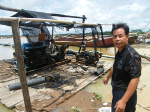 昨天上午11時許,記者與梁先生一同到現(xiàn)場了解情況。梁先生的金江沙場位于定安定城鎮(zhèn)和?谛缕骆(zhèn)交界處,已經(jīng)暫停作業(yè),工人們在工棚休息。記者在采沙船被毀現(xiàn)場看到,采沙船擱淺在岸邊,采沙機(jī)器完全被毀,電池?zé),木板千瘡百孔,表面被大火熏得烏黑,?nèi)部零件完全破壞。雖然距離案發(fā)已有10余天,當(dāng)時大火熊熊燃燒的情景依然可以想見。