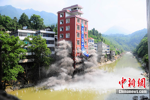 爆破既不能損壞連體的4層樓房,又不能長時間堵塞河道,倒塌距離必須嚴格控制在20米以內,技術要求高。工程施工方采取定向爆破和原地爆破兩種方式同時進行,安裝了60公斤炸藥對房屋實施爆破拆除,此次爆破非常成功,被網(wǎng)友稱為“最牛”的河中違章建筑終于強拆。