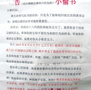 小陳在《告小偷書(shū)》中寫到:“假若你把我包里的證件寄給我,或者以其他的方式給我,無(wú)論是什么樣的方法,我一切遵從你的要求,我將施與你500元作為補(bǔ)償。因?yàn)槲沂敲麑W(xué)生,無(wú)更多的經(jīng)濟(jì)能力!衷心希望與你私下和解此事!”