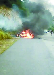 當車隊開到余姚梁弄的一條鄉(xiāng)鎮(zhèn)公路上時,其中一輛法拉利跑車車后的發(fā)動機突然冒出了大量濃煙。隨后整個車子開始熊熊燃燒,不到半個小時就燒得只剩下個底盤框架,幸虧發(fā)現(xiàn)及時,沒有人員傷亡。