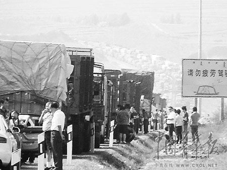 9月1日18時(shí)許,中國(guó)青年報(bào)記者搭車從集寧出發(fā),沿110國(guó)道由西向東(即往北京方向——記者注)行駛。當(dāng)駛過(guò)白海子收費(fèi)站(位于察哈爾境內(nèi)——記者注)約3公里時(shí),記者遠(yuǎn)遠(yuǎn)地看到前方的大貨車陸續(xù)停了下來(lái),這條“車龍”見(jiàn)尾難見(jiàn)首。