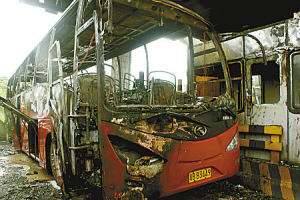 交警和消防人員接警后趕到現(xiàn)場,此前收費站工作人員已積極投入到滅火搶險中,乘客在司機的指引下均已從大巴砸碎的玻璃窗中順利逃出,在安全地方等待,無人員傷亡。在消防人員用高壓水龍頭噴射半小時后,大火才被撲滅了。