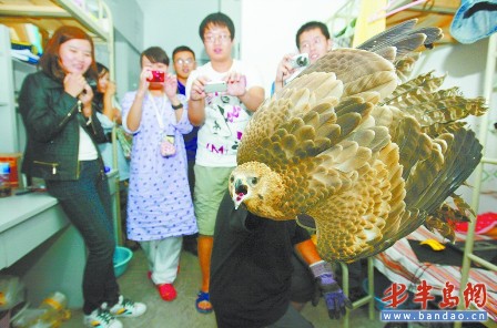 美術(shù)學(xué)院的女生小劉告訴記者,28日傍晚6時(shí)許,她第一個(gè)回到宿舍,剛進(jìn)門陽臺外突然飛進(jìn)來一只大鳥,沖著她的臉撲來,嚇得她抱頭尖叫,趕緊沖出了宿舍,“我仔細(xì)一看才發(fā)現(xiàn)是一只老鷹,我很害怕,就叫男生來幫忙了。”