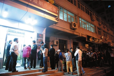 昨天凌晨5點(diǎn)多,海淀區(qū)婚登處門外已經(jīng)排起了近100米的長隊(duì)。排隊(duì)的人幾乎都是一對對,但排在第一位的卻只有一個(gè)人,是一名姓胡的中年男子。