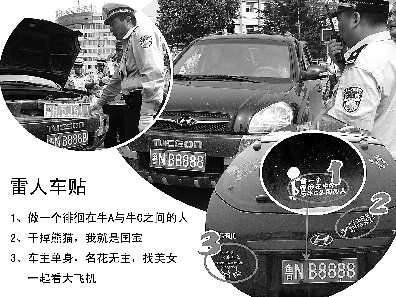 更讓民警哭笑不得的是,該車車身還貼滿了諸如“干掉熊貓我就是國(guó)寶”、“做—個(gè)徘徊在牛A和牛C之間的人”、“車主單身,名花無主,找美女—起看大飛機(jī)”等雷人標(biāo)語。(記者黃廣華通訊員侯明輝)