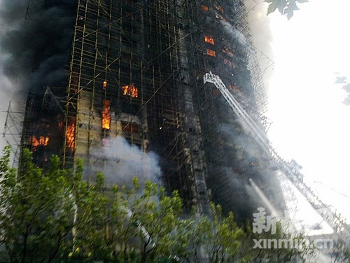 16時20分,大火持續(xù)了兩個多小時還未被撲滅,大樓內(nèi)仍有居民尚未逃出,頂樓還有不少被困居民在等待救援。新民網(wǎng)記者在現(xiàn)場看見,經(jīng)過大火猛烈的炙烤,已經(jīng)有腳手架在往下掉落了,現(xiàn)場十分危險(xiǎn)。
