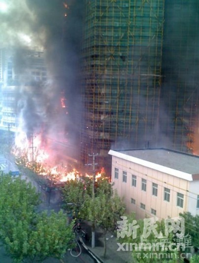 新民網(wǎng)記者在現(xiàn)場了解到,起火的大樓位于上海市靜安區(qū)膠州路707弄1號,火勢不斷蔓延,外立面的防護(hù)網(wǎng)已經(jīng)燒到了10層樓高。