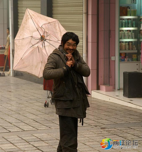 今日17點23分,有網(wǎng)友在華龍網(wǎng)兩江論壇放上了重慶街頭偶遇的“浮云哥”拍攝下的5張系列圖片,粉紅色雨傘配上嬌柔的表情,得到了百名網(wǎng)友的頂帖膜拜,紛紛稱“此人必火”。
