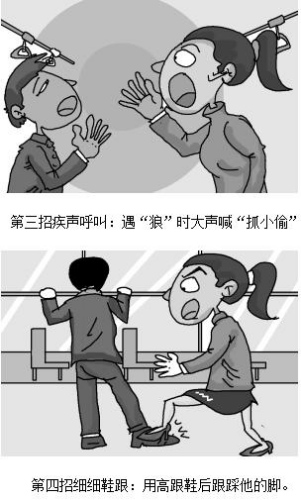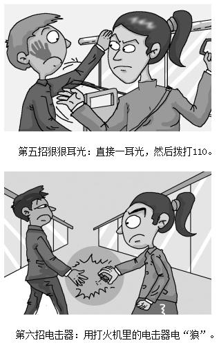 《公交防狼全手冊(cè)》發(fā)出后,引起了眾多女性關(guān)注,幾個(gè)小時(shí)之內(nèi)就有數(shù)以萬(wàn)計(jì)的網(wǎng)民點(diǎn)擊,其中防狼六招也成為女性之間互轉(zhuǎn)的信息。這六招分別是:第一招冷冷目光,是用威懾力眼神與“狼”對(duì)視;第二招尋找依靠,即向司機(jī)或者售票員靠近;第三招疾聲呼叫,就是遇“狼”時(shí)大聲喊“抓小偷”;第四招細(xì)細(xì)鞋跟,就是用高跟鞋后跟踩他的腳;第五招狠狠耳光,就是直接打耳光,然后報(bào)警;對(duì)于第六招就更有意思了,就是用一次性打火機(jī)里的電擊器電“狼”,產(chǎn)生瞬間電壓足以讓“狼”手彈回去,而且不產(chǎn)生直接傷害。