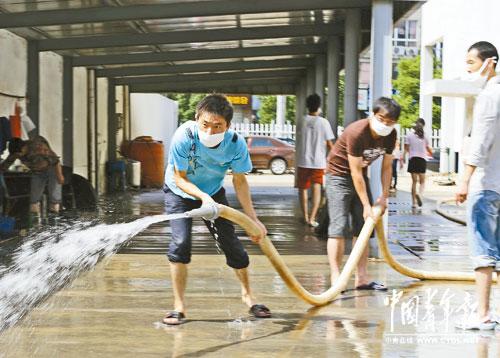 10月13日,在浙江省余姚市梨洲街道的一廠區(qū),從河南商丘來此打工的劉開會(左)和工友們一起清洗并消毒被洪水浸泡過的廠區(qū)。受臺風(fēng)“菲特”的影響,余姚遭受歷史上罕見的特大洪水,城區(qū)和鄉(xiāng)鎮(zhèn)大面積受淹。目前,城區(qū)的積水已基本排完,生產(chǎn)生活正逐步恢復(fù)正常。在余姚的外來務(wù)工人員有50多萬,災(zāi)情發(fā)生后,當?shù)匾龑?dǎo)鼓勵外來務(wù)工人員積極參與恢復(fù)生產(chǎn)的工作。 本報記者 陳劍攝