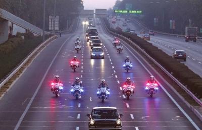 國(guó)賓護(hù)衛(wèi)隊(duì)員護(hù)衛(wèi)著國(guó)賓行進(jìn)在機(jī)場(chǎng)高速路上。京華時(shí)報(bào)特約記者李光印攝