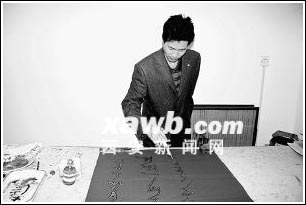 據(jù)王璽介紹,他自幼酷愛書法,2004年在西安學(xué)習(xí)期間,參加了由省政協(xié)組織的書畫活動,他見書畫名家雷長安表演的書法針筆運筆剛?cè)嵯酀,結(jié)字嚴(yán)謹(jǐn)多變,布局渾然大氣,風(fēng)格酣暢灑脫,便產(chǎn)生了針書創(chuàng)作的念頭。今年,他積極摸索,利用醫(yī)療器械注射器作為工具作筆寫字,將調(diào)和的裝飾材料溶液吸到針管里,蘸到“筆尖”上,使金墨銀墨在深色宣紙上流動成為書法作品,如同毛筆在生宣紙上寫字一樣有節(jié)奏、有韻律,極具觀賞性。 (記者張松)