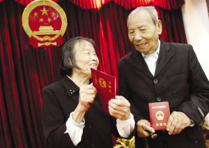 昨天,在鹿城區(qū)民政局頒證大廳,106歲的潘老先生和81歲的陳老太太領(lǐng)到了結(jié)婚證。潘老先生和陳老太太都是永嘉人,陳老太太8年前經(jīng)人介紹到潘老先生家里照顧老人起居,經(jīng)過8年的相知相伴,終于走到了一起。去年10月份,潘老先生參加了超級老人卡拉OK大賽,唱了一首《東方紅》,贏得了滿場喝彩,并得了獎。(記者 郭大斌)