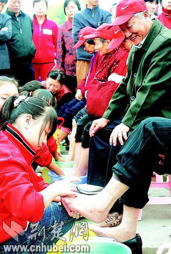 襄樊市委副書記萬桃元得知孫穩(wěn)、李聯(lián)德兩位百歲老人也到了現(xiàn)場(chǎng),忙迎上前為他們送去祝福。隨后,兩名志愿者來到兩位老人身前為其洗腳。其中一位志愿者名叫汪光房,今年51歲,是襄陽(yáng)區(qū)文聯(lián)的退休職工。他告訴記者:“敬老愛老是中國(guó)的傳統(tǒng)美德,每個(gè)人都應(yīng)該真心行孝,感恩老輩!