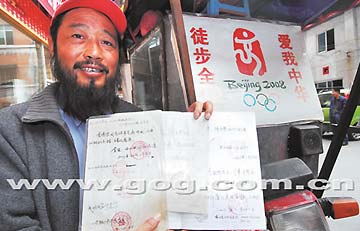10月21日下午,“徒步中國,宣傳奧運”的湖北宜都人李春華在貴陽河濱公園,向記者展示國家奧組委和他所到地區(qū)政府給他的題詞以及加蓋的公章。今年45歲的李春華,2000年12月26日從云南西雙版納開始實施自己多年的夢想,徒步全國,宣傳奧運。七年間,李春華歷經(jīng)風雨和苦難,足跡遍及大半個中國,預計23日從貴陽離開前往云南,走完這一行的最后一段。