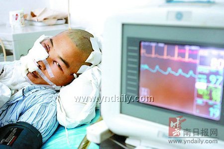 昨日,實(shí)施了面部縫合手術(shù)后,29歲的陳三拉靜靜地躺在昆醫(yī)附一院口腔頜面外科病床上,他的右臉全部被包了起來(lái),由于傷勢(shì)嚴(yán)重,已經(jīng)很難開口說(shuō)話。