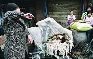 開小飯館的祿老太,每天早上都到慶豐市場買菜。24日一大早,她提著籃子到市場上轉(zhuǎn)悠,不經(jīng)意間看到一幕,讓她很吃驚:有人正在殺狗。