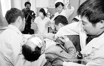 28日下午,幾年前被評(píng)為南昌市“十大文明之星”之一的78歲老人沈偉華在老福山立交橋下制止一“破爛王”打鑼發(fā)出噪音時(shí),竟遭兩個(gè)20多歲的年輕男子譏笑為“多管閑事”,雙方發(fā)生爭(zhēng)執(zhí)后,一名男子掄起拳頭就朝沈老臉上砸去,隨后就是一頓猛打,幾分鐘后,兩男子揚(yáng)長(zhǎng)而去。路人報(bào)警后,沈老被送進(jìn)醫(yī)院。據(jù)介紹,沈老頭部及腰背部多處軟組織挫傷。目前,繩金塔派出所正在調(diào)查。圖為醫(yī)護(hù)人員正在搶救。 (記者 肖佩佩 王辰/圖)