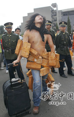 又是他!繼今年5月1日在南屏步行街以全身貼滿人民幣的形式進行了一場名為“金錢加權(quán)力等于一切嗎”的行為藝術(shù)后,云南藝術(shù)學(xué)院03級油畫班畢業(yè)生王軍昨天背負磚頭行走兩個多小時,用他覺得最棒的方式說一聲:“昆明,我走了。”