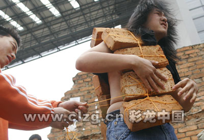 特殊的氣氛讓路過的學(xué)生和市民紛紛停住了腳步。10點30分,王軍在朋友的幫助下開始“裝備”。他脫去上衣,將一件黑T恤裹在脖子上,肩膀上掛上了26塊磚——每塊重約2斤,一時間,悠閑的表情變成了“臉紅脖子粗”。拖上一個裝了20塊磚的行李箱,王軍深呼了一口氣,走入云南藝術(shù)學(xué)院,準備穿過校園,經(jīng)西站沿西昌路、昆紡,抵達目的地昆明火車站。