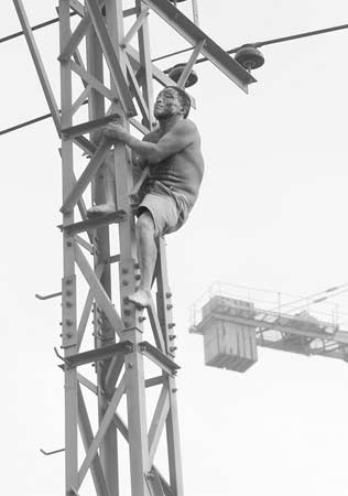 為躲避追打,他冒著被電擊的危險,爬上路邊 10米高的電線桿。