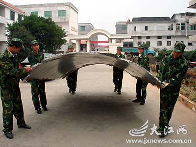 24日18時(shí)05分,中國第一顆探月衛(wèi)星“嫦娥一號(hào)”成功發(fā)射升空后,西昌衛(wèi)星發(fā)射中心致函廣東韶關(guān)市和江西贛州市,要求做好運(yùn)載火箭整流罩殘骸落點(diǎn)標(biāo)點(diǎn)和回收工作,并做好落區(qū)群眾的宣傳和防護(hù)等善后工作。殘骸的一部分28日在廣東始興縣發(fā)現(xiàn)回收后,30日,飄落于江西全南縣南逕鎮(zhèn)的另一部分長約4米,寬約1.5米左右的整流罩殘骸被全南縣人武部成功回收。