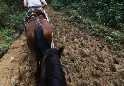 按這里的規(guī)矩,如果你之前沒有騎過馬,馬主人會慫恿你請一個養(yǎng)馬人領(lǐng)馬,這樣做的確是“為了你的安全”,可加上領(lǐng)馬人自然就多了一匹馬,而這匹領(lǐng)馬的費用與我們租用一匹馬的費用相同,同樣也由游客承擔(dān)。當(dāng)日,我們與一名養(yǎng)馬的女主人談定價格準(zhǔn)備騎馬上山時,忽然風(fēng)雨大作,眼看本來泥濘的馬道積滿了更多的雨水,大家只好掃興地放棄騎馬上山的打算。