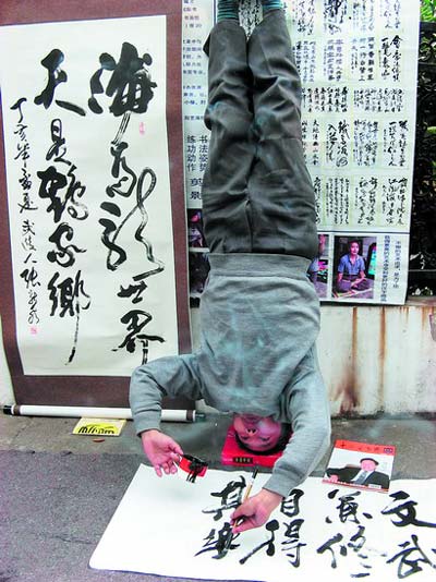 而張老練習(xí)倒立書法純粹是機(jī)緣巧合。2002年的一天,他從報(bào)紙上了解到有人可以俯臥著寫書法,于是便想自己既然可以倒立,能不能倒立著寫書法呢?有了想法就開始行動(dòng),起初,張老練倒立寫字只能堅(jiān)持幾分鐘,經(jīng)過一番苦練,現(xiàn)在張老已經(jīng)能夠堅(jiān)持20分鐘左右,一口氣能寫3幅總共100字的作品。