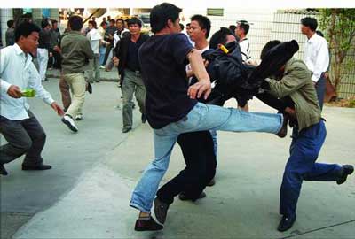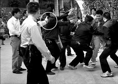 5分鐘后,校方員工再次出動,有的人手上還拿著兩根一米長的鐵棍,而工人們順勢從門口的竹籬笆處拔下七八根碗口粗的毛竹對鐵棍,雙方開始一場混戰(zhàn),“啪、啪”聲不絕于耳。兩三分鐘后,毛竹被打爛,就在工人高喊著找磚頭時,警方趕到。一名警察一邊高喊“不許打架”,一邊拿著手中的辣椒噴霧器對著打斗雙方噴射……