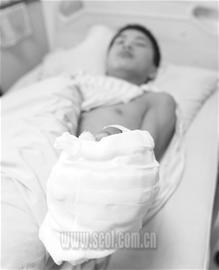 10月28日這一天,周末。曾薛說,“當(dāng)天上午9時(shí),爸爸騎摩托車送媽媽去郫縣上班,我將門關(guān)上準(zhǔn)備打開復(fù)讀機(jī)補(bǔ)習(xí)英語。”曾薛是個(gè)“左撇子”,他用左手按復(fù)讀機(jī)開關(guān),無任何反應(yīng);第二次再按,仍無濟(jì)于事;第三次按開關(guān)時(shí),“嘭”的一聲巨響,曾薛被從凳子上炸倒在地,昏迷過去!拔一杳粤擞7分鐘左右的時(shí)間,二爸曾興樹聽到爆炸聲之后,撞開門,將我送到鄉(xiāng)上衛(wèi)生站搶救!痹φf,他蘇醒過來才發(fā)現(xiàn)左手的大拇指、食指和手掌的肉都被炸爛了,露出了骨頭。這時(shí)才知道,復(fù)讀機(jī)當(dāng)時(shí)就被炸碎了,碎片散落一屋。曾薛說,事發(fā)時(shí)他未用電源,而是使用的電池