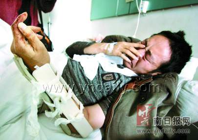記者看到李君鐘時,他正準(zhǔn)備做手術(shù),主治醫(yī)生告訴記者,李君鐘多處軟組織挫傷,頭部受傷縫了7針,左臂骨折,傷情跡象表明,肯定是嚴(yán)重的外力所致!拔以趺催@么倒霉。∫驗檎也坏阶约旱能,就挨了一頓打!”說起當(dāng)晚的情形,李君鐘忍不住淚流滿面,他說,當(dāng)晚,因為和朋友多喝了幾杯,記得自己的車停在錦苑花園小區(qū)門口,但可能是喝多了,到門口一看,卻怎么也找不著車了,難道車被偷了?他趕緊四處找車,不知不覺就進(jìn)了小區(qū)。剛進(jìn)小區(qū),突然有幾名保安跑過來,二話沒說就開始打他……