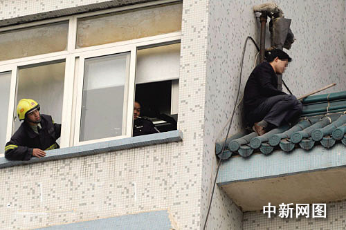 欲跳樓的男子手持一根一米長(zhǎng)的帶釘木棍,半蹲半坐地倚在四樓樓頂?shù)墓战翘,他不斷揮舞著木棍防止他人靠近。在二樓的平臺(tái)上,派出所民警嚴(yán)陣以待,隨時(shí)準(zhǔn)備處置突發(fā)事件。四樓樓頂,艱難的談判正在進(jìn)行,衛(wèi)生部門的一位負(fù)責(zé)人與男子不停地交流著,此時(shí)男子的情緒相對(duì)穩(wěn)定,但只要看到民警靠近,男子就會(huì)立刻警覺,并將身子向樓頂邊緣靠去。