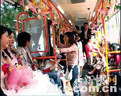 “一開始打算用寶馬當(dāng)花車,但如果只租三四輛寶馬就不夠氣勢了,租七八輛又太貴,所以最后決定用一部超長的車來當(dāng)花車,這樣既有氣勢又可省錢!辟囅壬嬖V記者,他把地面上能用的交通工具都想了個(gè)遍,后來經(jīng)過自家門口的同德圍車站時(shí),突然發(fā)現(xiàn)215路公交車既長又寬,完全符合他的設(shè)想,因此定下來由它做花車。“這樣我和新娘,還有一幫朋友都可以聚在車?yán)锿,好像舉辦一個(gè)結(jié)婚PAR-TY,很過癮。”賴先生說。
