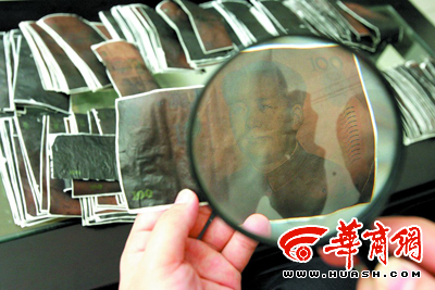 隨后,暢續(xù)達(dá)及同事朱江對劉先生的“現(xiàn)金”進(jìn)行了初步鑒定,暢續(xù)達(dá)說:“按照殘幣兌換的相關(guān)辦法,殘幣面積在大于1/2,小于3/4之間的,可兌換半額。面積在大于3/4的可等額兌換”。根據(jù)劉先生目前粘貼的殘幣情況看,雖然炭化比較嚴(yán)重,但是單張殘幣斷裂現(xiàn)象不嚴(yán)重,按照相關(guān)兌換標(biāo)準(zhǔn),可兌換5到6萬元現(xiàn)金。
