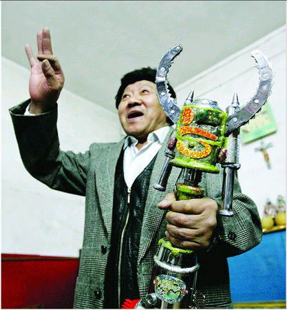 看看這東西,您知道它是干什么用的嗎?這是一件“武器”,是鄭州市民78歲老漢胡國平的新“發(fā)明”,他說,這件“武器”威力可不小,它集10種功能于一身,可分上下左右前后多方位攻擊敵人,也能釋放辣椒水噴射敵眼,可攻可守,如能推廣,將是民警與巡防隊員制敵防身的有力武器。