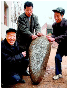 張步高發(fā)現(xiàn)一塊石頭上面刻著怪字的消息不脛而走,周圍的鄉(xiāng)黨紛紛前來看稀奇,可就是沒有一個人能認(rèn)得這怪字。為了弄清這塊石頭的來龍去脈,特別是它上面字的含義,張步高老人說他半年來,請了不少行家里手,甚至別人特意介紹的專家教授,可到目前,還是沒有人能說出個所以然來。張老說盡快揭開蒙在這石頭上的神秘面紗,已成為自己的一塊心病,希望有關(guān)部門和專家能和他聯(lián)系,把被人們傳得沸沸揚(yáng)揚(yáng)的石頭解釋得明明白白,真實(shí)可信。(記者 張波文/圖)