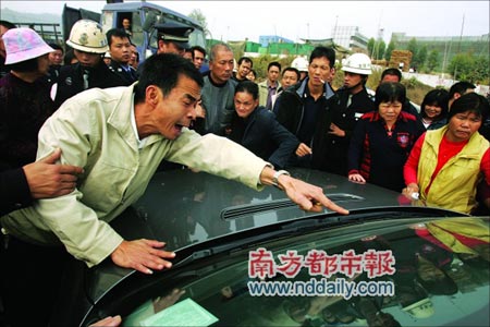 這時,現(xiàn)場民警沖進人群,強行拉開攔車的居民,并讓治安員排成人墻,近十分鐘后,港商才駕著寶馬車離開。鄭女士說,她自己的土地買了三年多,一直被人霸占著,雖然在半個月前,他們就在這塊土地上貼出通知,并把所有的合法材料張貼出來,告知他們兩周后動工建廠。誰知,還是不能施工,不知道這樣何時是個盡頭。