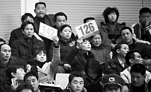 這是地壇廟會(huì)拍賣的現(xiàn)場(chǎng),100多名商戶正爭(zhēng)奪明年春節(jié)廟會(huì)的45個(gè)飲食攤位。