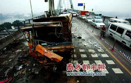 當時,開車經(jīng)過現(xiàn)場的陳先生目擊了事故全過程。他說,泥頭車速度很快,壓著靠近護欄的內(nèi)側(cè)車道由北往南行駛,行至上橋近100米處時,突然“挨上”護欄,將護欄一路推前了大概十五米。“奇怪!它前面沒多少車,身邊也沒人超他車”,陳先生說。泥頭車撞上迎面駛來的一輛中巴后,又頂住中巴,將其推到大橋邊上!靶液脴蜻呌需F絲網(wǎng),不然肯定掉下去了”。