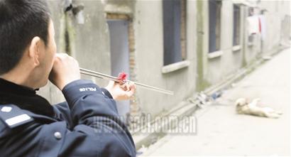 無(wú)奈之下,警察們只好分頭堵截,采取迂回靠近方法。半個(gè)多小時(shí)后,終于將這條流浪狗堵在小巷內(nèi)!昂脵C(jī)會(huì)!”賈世釗不慌不忙地將麻醉針管裝入不銹鋼空心管中,在5米開(kāi)外對(duì)準(zhǔn)白狗輕輕一吹。只見(jiàn)麻醉針管在空中劃出一條曲線,擊中流浪狗脊背,但遺憾的是針管歪向了一邊。受驚后的白狗企圖逃跑,賈警官立即吹出了第二針,這下針管穩(wěn)穩(wěn)地扎進(jìn)了白狗背部。一秒,兩秒……幾秒鐘后,白狗開(kāi)始搖晃,接著便軟軟癱倒在地。