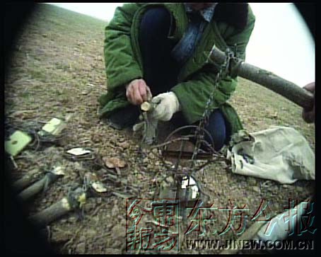 記者在遠處觀察,只見兩人把大量的鐵夾置于沙土上,鐵夾上連著一條鐵鏈,鐵鏈上再綁一個木橛子,木橛子被深深地釘在地上。