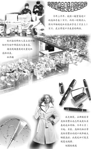 據(jù)杭州海關(guān)有關(guān)負(fù)責(zé)人分析,目前高檔消費(fèi)品走私犯罪手法日益隱蔽,集團(tuán)化和網(wǎng)絡(luò)化日益明顯,并且有向高檔消費(fèi)品全行業(yè)蔓延的趨勢(shì)。除了豐厚的利潤誘惑外,高檔消費(fèi)品在銷售渠道管理方面的混亂也讓走私有機(jī)可乘。