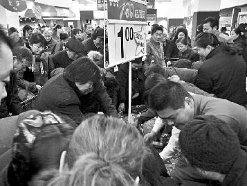 昨天上午8時(shí)30分,沃爾瑪洛陽市景華路店開門迎賓,在地下一層大賣場,1元可樂和雪碧成為前來購物市民的首選。老人們蜂擁而上(如圖)。雖然標(biāo)牌上寫著“每人限購5聽”,但不少老人只顧彎腰往懷里揣,全不顧被踩踏的危險(xiǎn)。(記者 楊非)