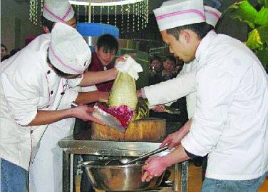 飯店內(nèi)敲著鑼表演活殺鱷魚