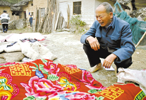 記者在一位老農(nóng)的指引下,才找到位于深山中的案發(fā)現(xiàn)場。清晨7時(shí)的深山很安靜,路邊的屋內(nèi)傳來一陣陣低沉的哭聲,草地上殘留大攤的血跡,似乎還沒有完全干涸。在瓦房對面的一個(gè)曬臺上,幾卷破舊的棉被和一堆雜亂的衣服中露出一只人腳,帶“喜”字的棉被下面蓋著尸體,現(xiàn)場沒有任何人看管,沒有警戒線,也沒有警車和警察,一切都顯得那么靜謐。