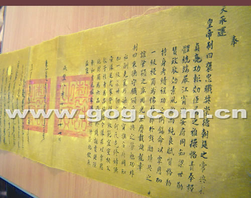 隨后,丁老伯小心翼翼地打開(kāi)用黃布裹得嚴(yán)嚴(yán)實(shí)實(shí)的兩件祖?zhèn)鞑仄。其中一件是有龍鳳等花紋的絹布,左邊是滿文,右邊是繁體漢字,開(kāi)頭兩行寫(xiě)的是“奉天承運(yùn),皇帝制曰……”,中間有兩個(gè)大的紅印,最后的落款是咸豐八年十一月十七日。丁老伯說(shuō),他也曾經(jīng)咨詢過(guò),這種絹是古代專門(mén)用于皇帝發(fā)布圣旨的圣旨絹。
